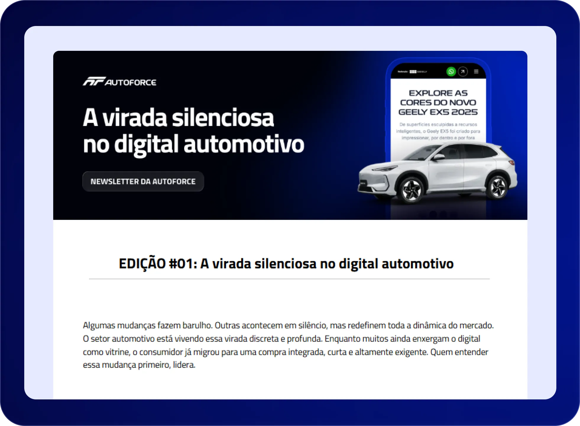 É uma curadoria estratégica sobre marketing, vendas, tecnologia e performance no setor automotivo. Um resumo do que realmente importa para quem precisa decidir melhor e gerar mais resultado no digital.